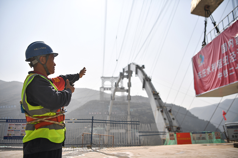 2023年10月10日,中铁二十局工人在陕西东庄水利枢纽泾河大桥施工现场指挥吊机进行吊装作业
